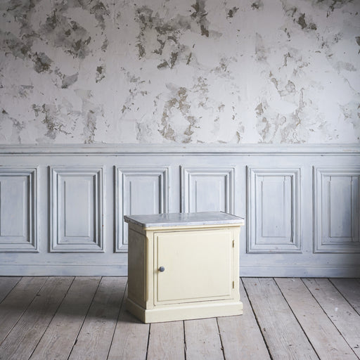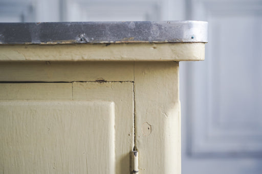 Antique Shop IWARE優しいバターイエローのペイントと、金属天板(メタルトップ)の組み合わせが愛らしい、フランスアンティークのキャビネットです。 天板にはアルミ製と思われる素材が使われ、時を重ねた擦れや傷が独特の表情を醸し出しています。内部は棚板で2段に分かれ、実用性も十分。 野菜のストック棚やコーヒー道具の定位置...