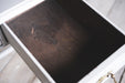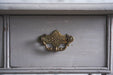 脚部のクラシカルな削り出しや、真鍮製の小ぶりな引き手金具も見どころ。引き出し内部の素朴な木肌との対比が、素材の豊かさを引き立てます。