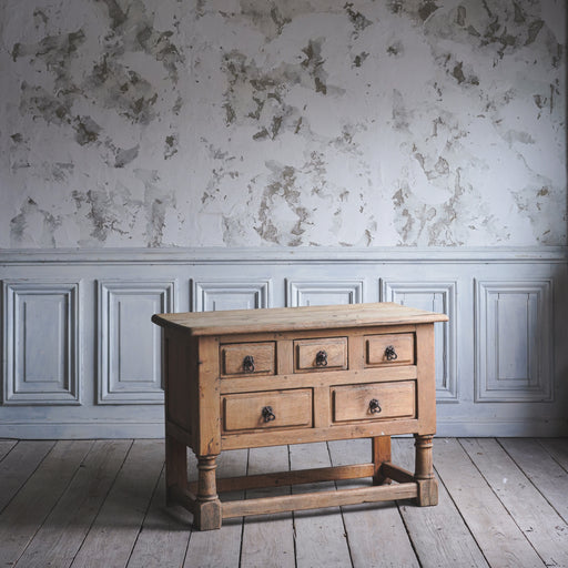 無垢のパイン材で丁寧に組まれた、アンティークチェスト。 引き出し前板にあらわれた豊かな木目や、節のひとつひとつに刻まれた時間の跡が、この家具の静かな説得力となっています。仕上げは厚塗りのないオイルフィニッシュで、木そのものの呼吸を感じさせるマットな質感。 使い込まれたアイアン製のリングハンドル...