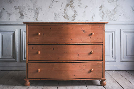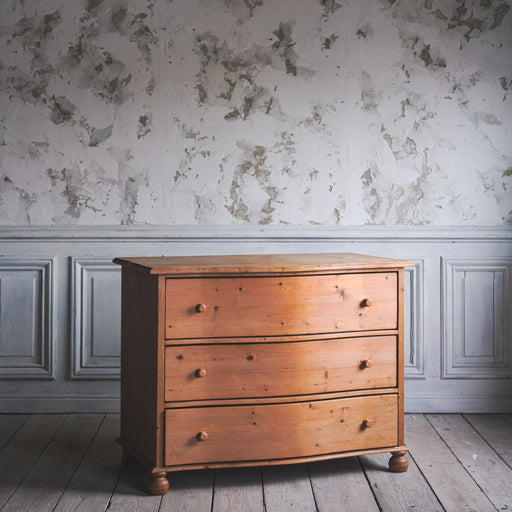 美しい曲線を描くフォルムが印象的な、3段タイプのアンティークチェスト。 ナチュラルなパイン材の質感がやさしく、年月を重ねて生まれた風合いが、どこか懐かしく心を和ませてくれます。 前板には繊細な装飾ラインが施され、シンプルながらも上質な印象。 丸みのある脚部や小ぶりなつまみも魅力的で、クラシカル...