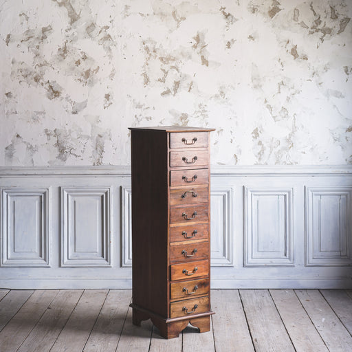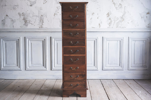 英国製アンティークの9段チェスト。複数の引き出しが縦に並び、小物から書類までを整然と収納することができます。 滑らかな木肌と落ち着いたダークブラウンの風合いは、年月を経てなお深みを増し、どんな空間にも品のある佇まいをもたらします。 真鍮製のハンドルにはわずかな経年のくすみが見られ、ヴィンテージ...