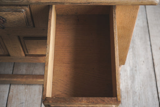 引き出し前面には、左右対称の装飾とともに中央にあしらわれたハート型のモチーフが温かみを添えています。 年月を経た無垢材の風合いは、陰影豊かでありながらもどこか軽やかさを感じさせ、クラシカルでありつつも重すぎない存在感。 ロカイユ装飾が施されたアイアンハンドルも、家具全体の優雅な雰囲気を引き立て...
