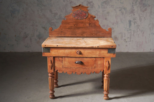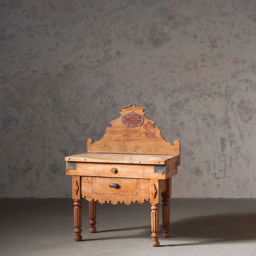 Antique Shop IWAREこちらは、かつて肉を切るための作業台として使われていたブッチャーテーブル。 現代では再現不可能ともいえるほど分厚く、重厚な一枚板の天板には、ナイフ跡や窪みがしっかりと刻まれています。 長い年月、丁寧に手入れされながら愛用されてきた証。 背面には「P. PARK」のラベルが残り、この家具が歩んで...