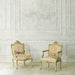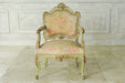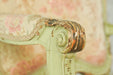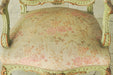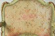 座と背にはローズやリボンが織り込まれたジャガード織が用いられ、やわらかなペールトーンの中に上品な気品が漂います。色褪せや擦れも含め、歴史の温もりを宿す美しい一対。