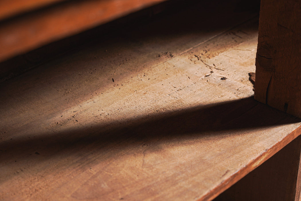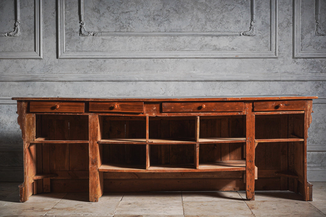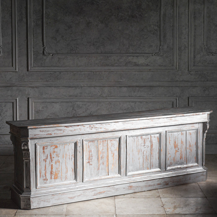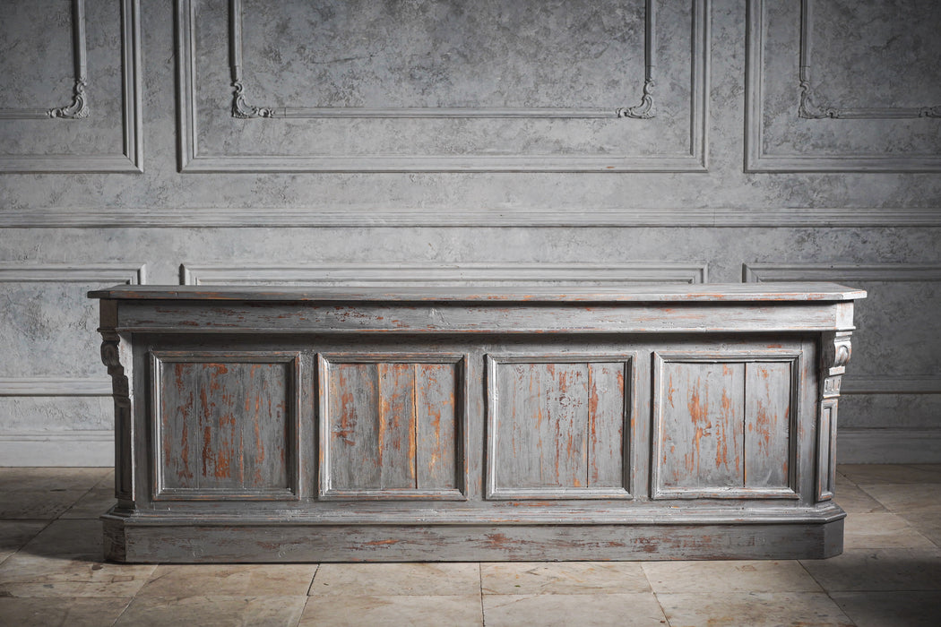 かつて商業空間の顔だったと思わせる存在感あるアンティークカウンター。